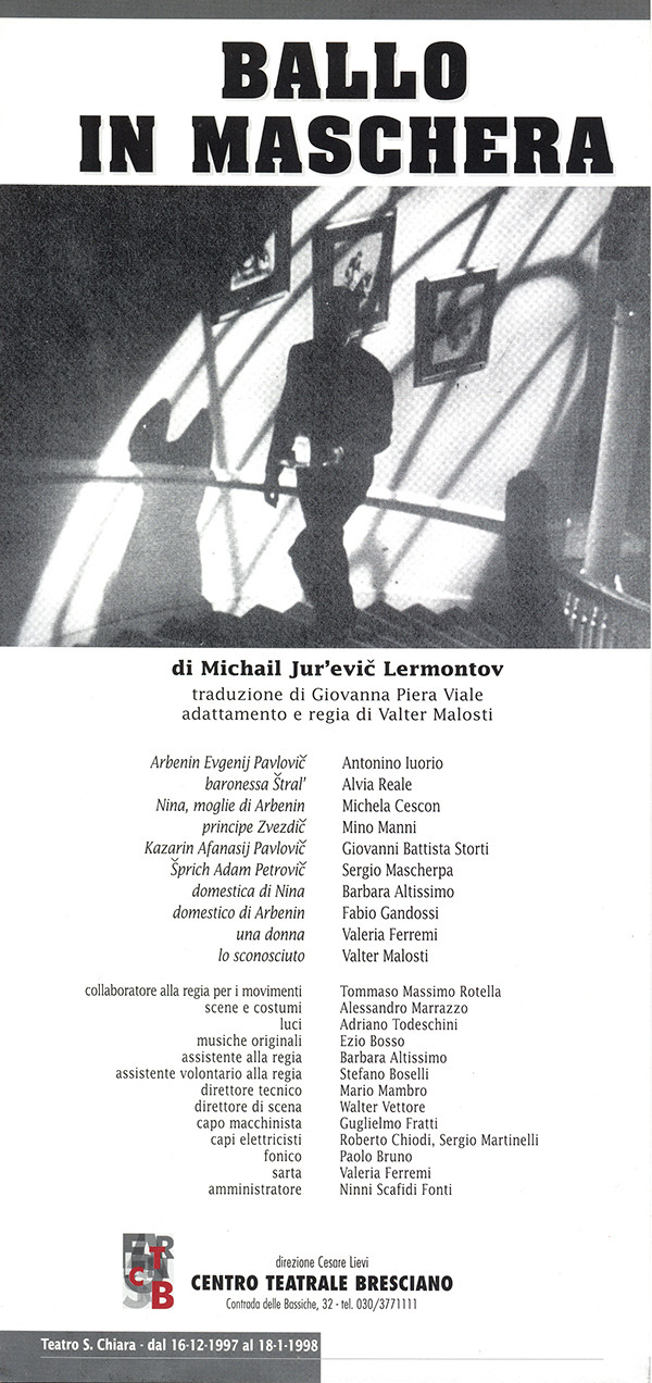 For a while I collaborated with an energetic company of young actors, I Mercenari in Milan, Italy. This show took its title from the fact that many scenes from different plays were tied together in the context of an asylum, which gave us a lot of freedom in experimenting. The show had quite a few versions adapted for different types of venues, from regular theatres to outdoor settings and dinner theatres.